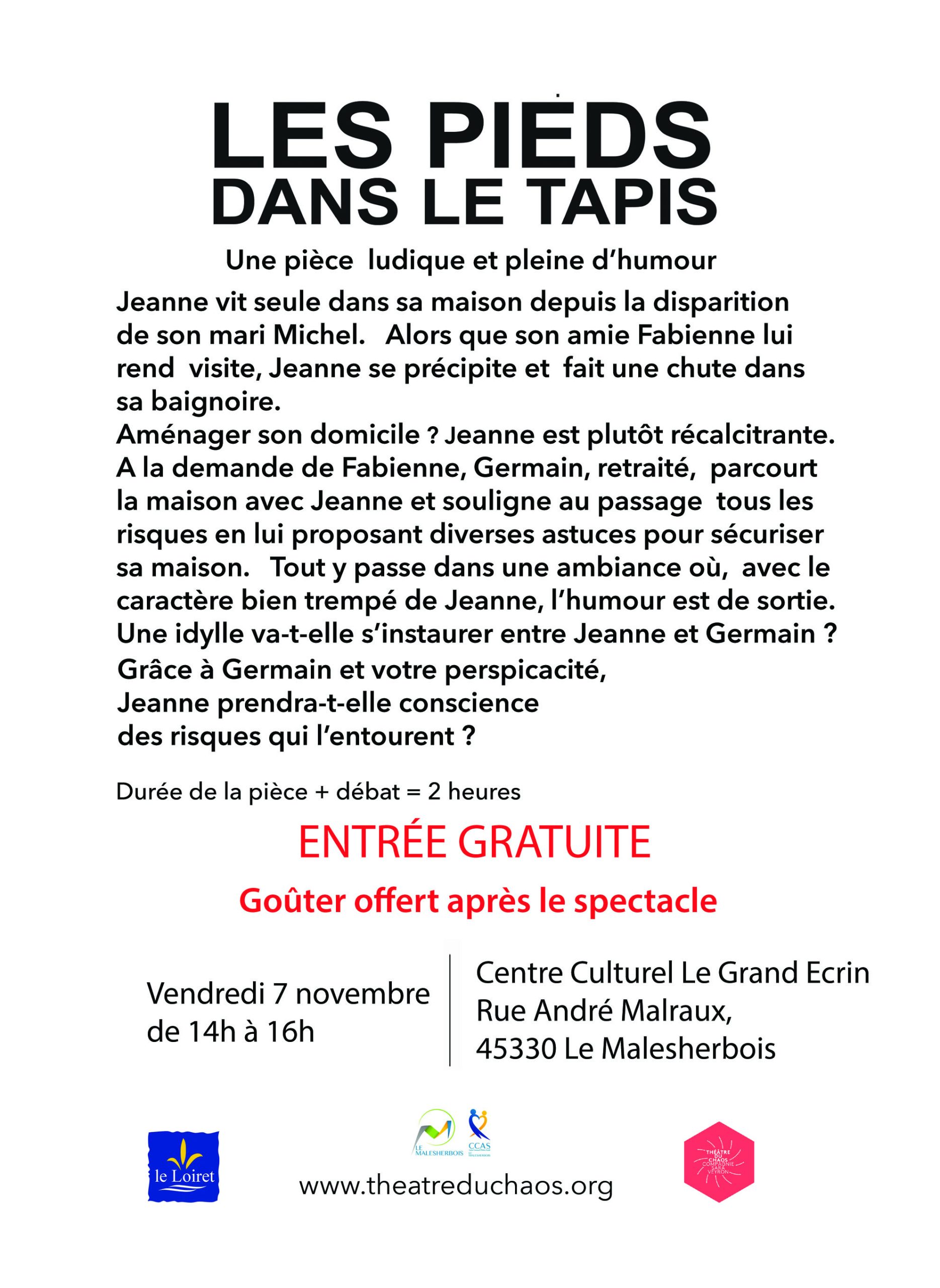 Le Théâtre du Chaos vous invite à découvrir « Les pieds dans le tapis », une comédie drôle et ludique qui vous fera prendre conscience des petits dangers du quotidien à la maison… tout en éclatant de rire !