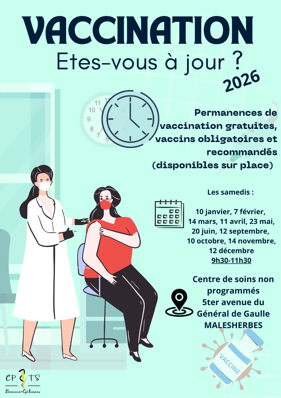 La CPTS Beauce Gâtinais organise des permanences de vaccination gratuites un samedi par mois de 9h30 à 11h30 au Centre de Soins Non Programmés.